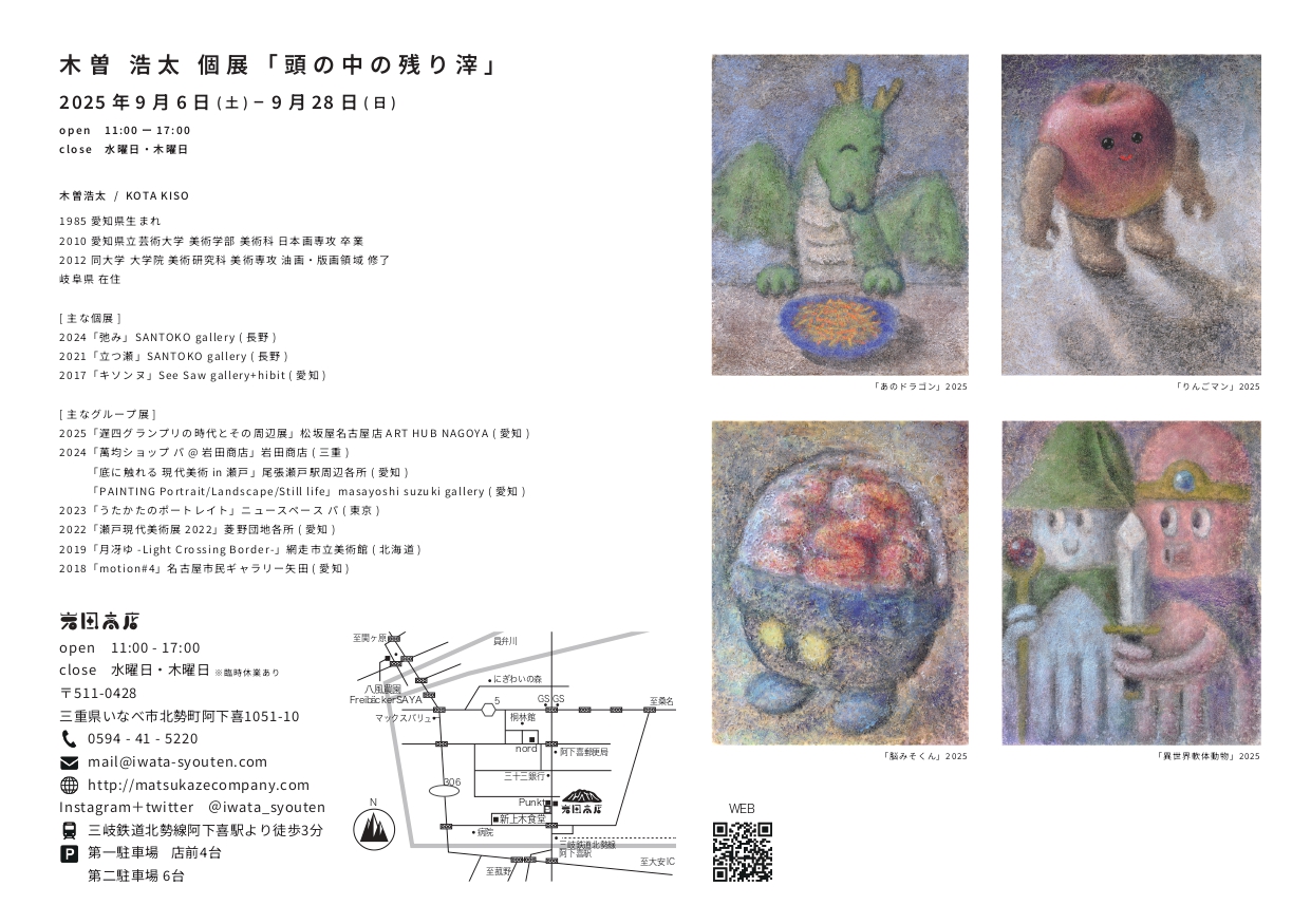 アーティスト・木曽浩太の個展『頭の中の残り滓』が、9月6日から三重・岩田商店にて開催される。