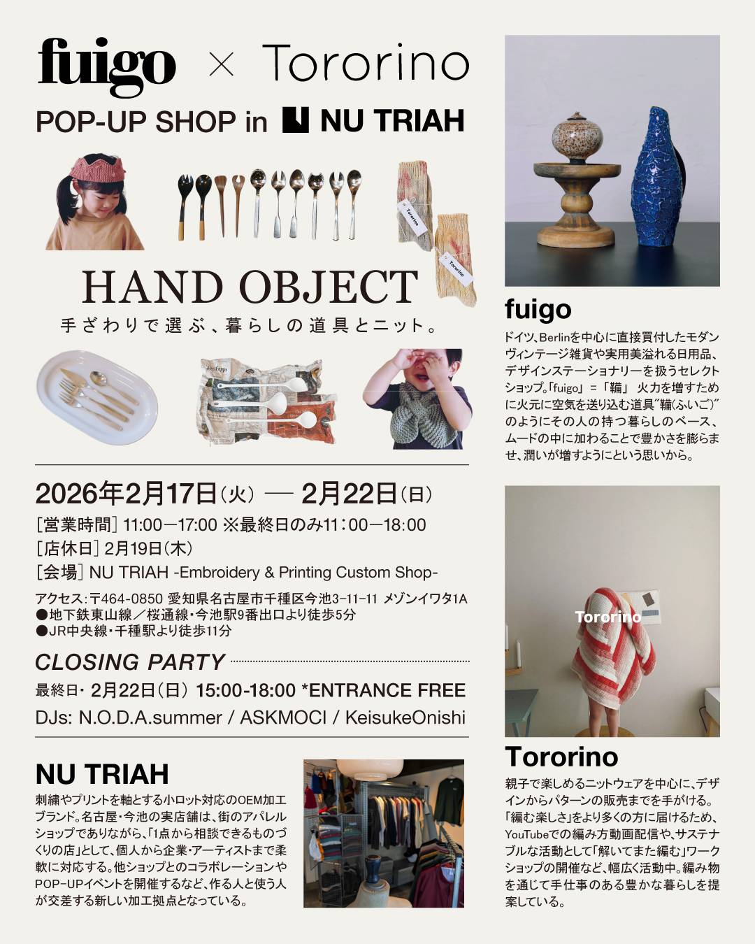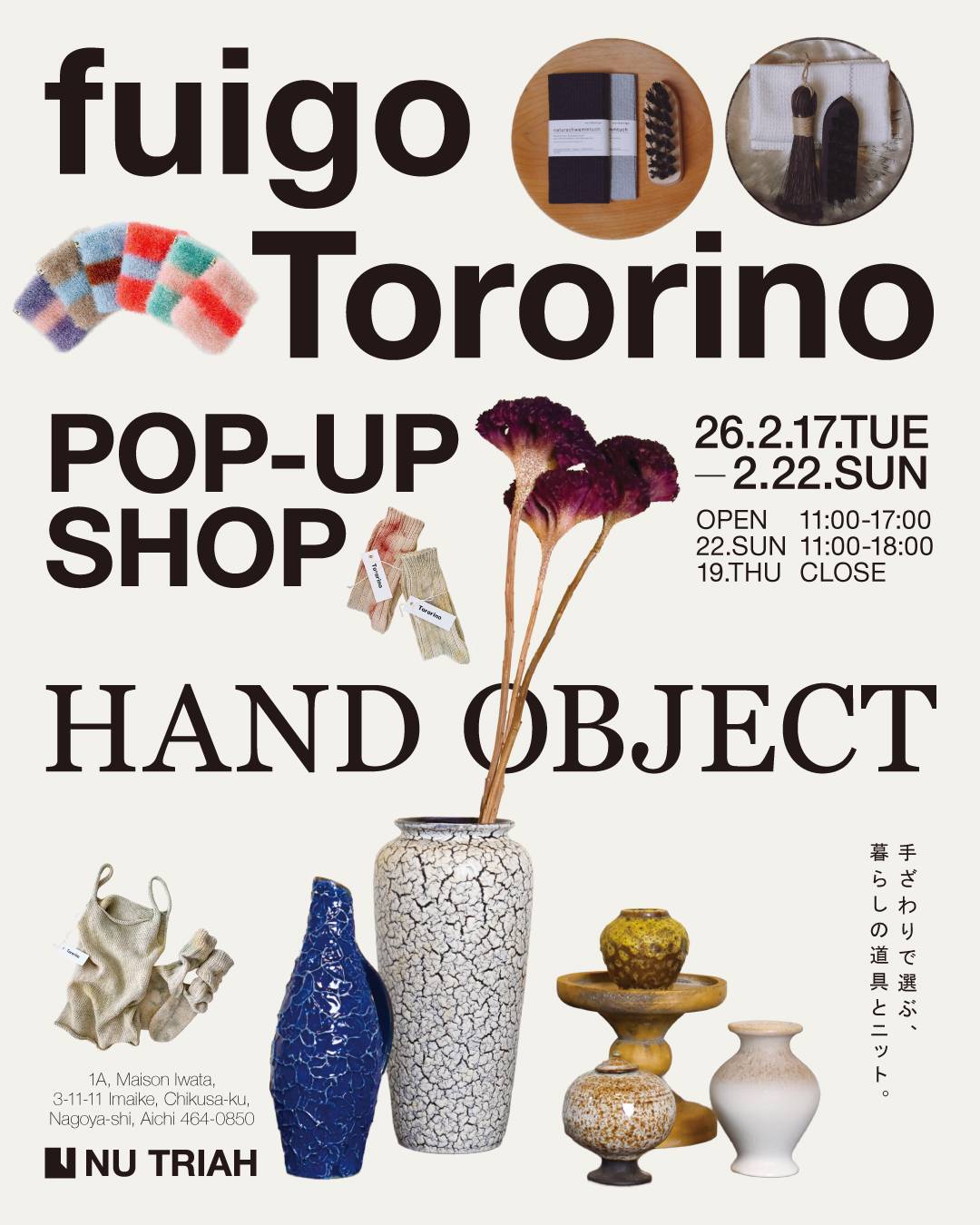 ドイツのモダンヴィンテージアイテムや日用雑貨を扱うfuigo と、オリジナルデザインの手編みニット・Tororino による JOINT POP UP「HAND OBJECT 手ざわりで選ぶ、暮らしの道具とニット」が今池・NU TRIAHにて開催される。会期は、2月17日(火)〜2月22日(日)まで。