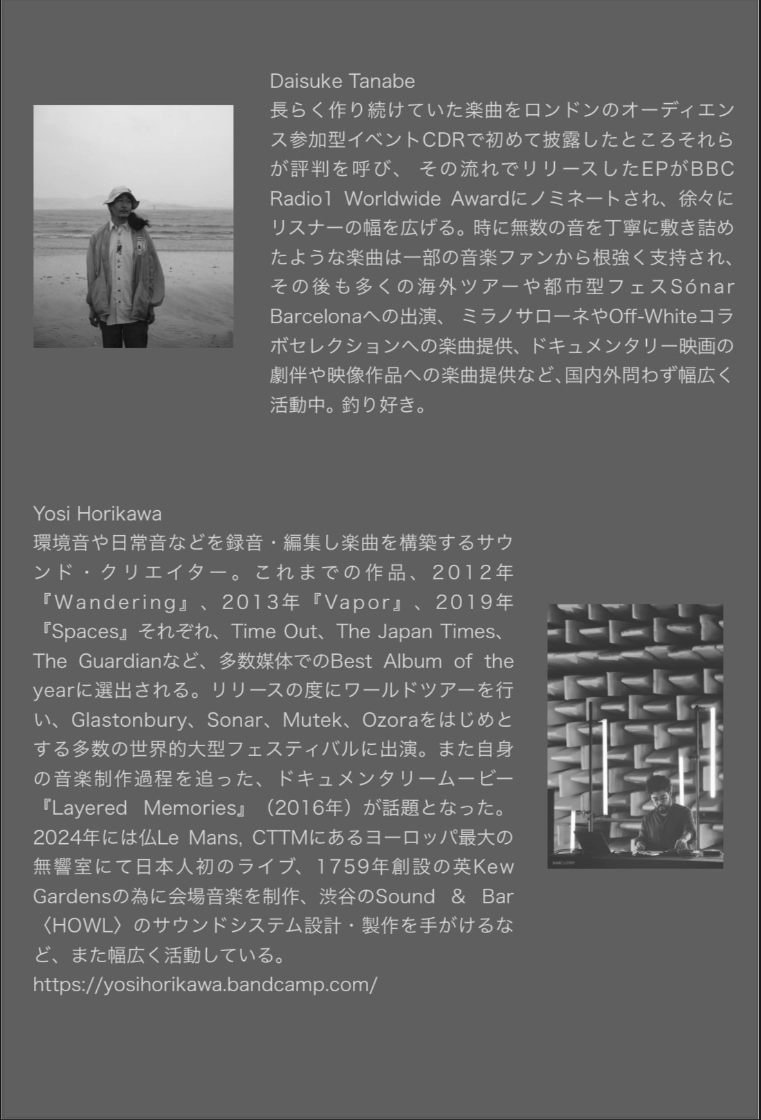 フィールドレコーディングと電子音楽を融合し、常に独自の音世界を切り開いてきたDaisuke TanabeYosi Horikawa、それぞれの最新作リリースパーティが岐阜・slow roomと東別院・DUCTの2会場で開催される。